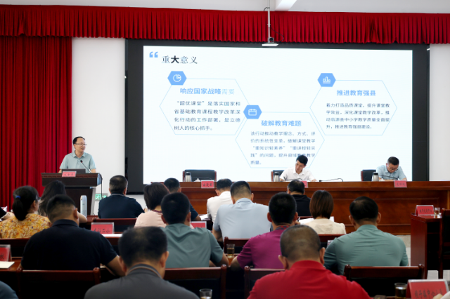 为推动《韶关市中小学校实施“韶优课堂”三年行动方案(2025-2027)》落实落地,促进全县中小学教学质量全面提升。2025年6月4日下午,县教育局召开全县中小学校校长工作会议,重点部署“韶优课堂”实施工作。教育局领导、相关股室负责人,教师发展中心中层以上干部,督学组长,全县中小学主要负责同志近60人参加会议。