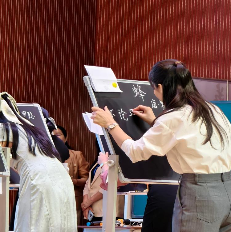 5 月26日上午的比赛现场,张美琴老师以独特优美的声线与极具感染力的演绎,将朗诵文本诠释得淋漓尽致;粉笔字书写时,她工整隽秀的字迹,尽显书法艺术之美,在才艺展示环节,她的身姿轻盈灵动,情感真挚自然流淌,演绎着《如愿》的艺术魅力,瞬间点燃全场,赢得雷鸣般的掌声。