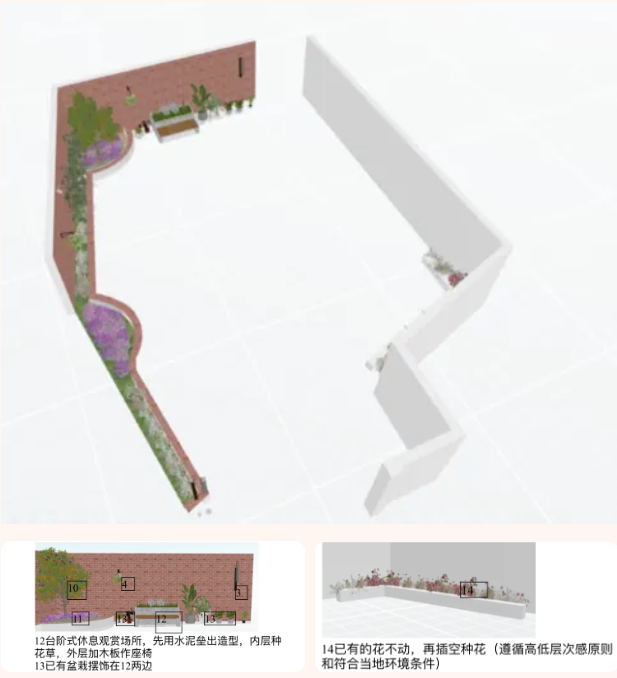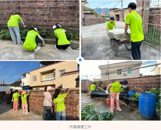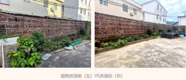 方案完成后,团队作图成员将新的布局和装饰向户主讲解,征得户主同意后,全体成员开始清理杂草、修剪花草树木、清扫围墙等,为庭院改造做好准备。此外,团队还积极参与上中坌村村委会外墙改造,坚持实用性和美观性相结合,对村委会外墙进行可视化及绿化处理。