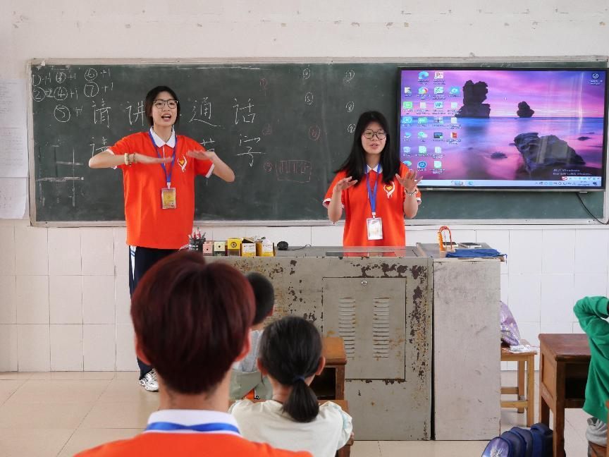 活动当天,外语商务学院志愿者们精心准备了丰富多样的教学内容,普通话推广活动也在有序进行。志愿者们通过趣味绕口令、诗歌朗诵等形式,向小朋友们宣传普通话的魅力与重要性。小朋友们积极参与,跟着朗读、练习,稚嫩的童声在校园里回荡,普通话的种子在他们心中悄然种下。