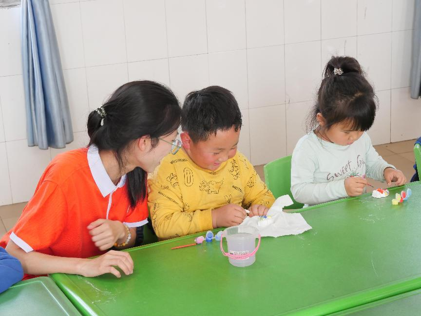 外语商务学院志愿者指导小朋友画石膏娃娃