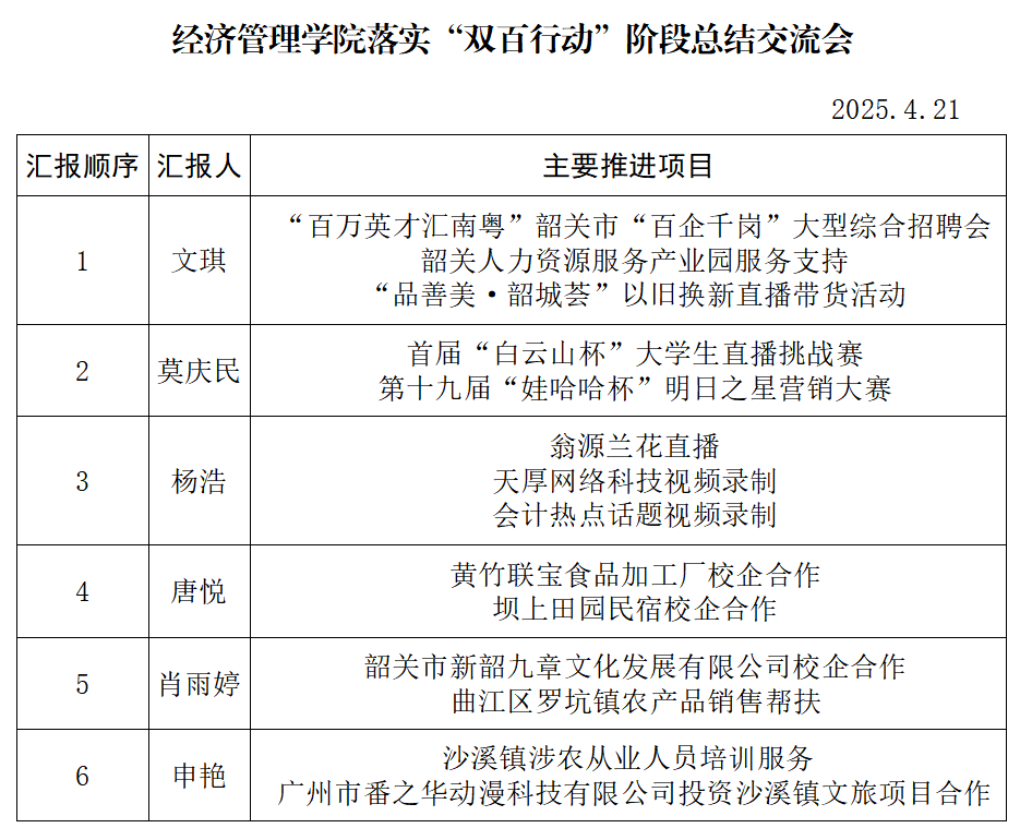 刘春朝在总结中表示,“双百行动”实施以来,全院师生秉持“专业链对接产业链、知识链服务需求链”的产教融合理念,组建跨专业服务团队,通过走访调研、驻点帮扶、服务支持等方式走进乡镇、深入企业,取得了一定成效。针对工作过程中遇到的难点和堵点,学院将持续完善“目标管理、动态监测、成果转化”的全链条推进机制。大家要继续聚焦韶关城乡融合发展,在产业发展规划、农产品品牌建设、电商人才培养、基层公共服务创新等方面注入“经管动能”,实现校地“双向赋能”;要充分发挥学科专业优势和人才优势,推动人才培育向“数字+”复合型升级,促进科研攻关向产业链痛点升级,深化社会服务,确保“双百行动”各项任务高质量完成。
