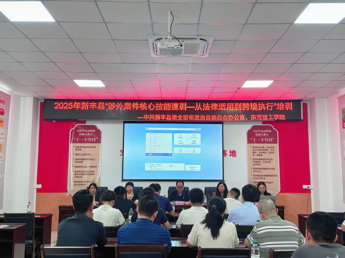 为强化涉外法治人才多层次、多领域涉外法治工作培训,提升律师办理涉外案件的实务能力,4月23日,新丰县委依法治县办公室联合“双百行动”结对院校东莞理工学院到马头镇军二村习近平法治思想学习宣传阵地组织开展“涉外案件核心技能速训——从法律适用到跨境执行”专题培训。培训特邀广东知恒(东莞)律师事务所赵丹律师担任主讲,全县公职律师、各律师事务所执业律师及各司法所所长等30余名法律工作者参加。