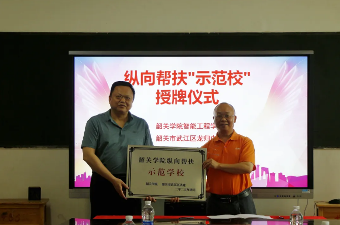 仪式上,韶关学院智能工程学院与龙归镇中心小学、龙归中学签署了纵向帮扶“示范校”建设协议,并进行了授牌仪式。此次签约标志着韶关学院智能工程学院与龙归镇中心小学、龙归中学正式建立纵向帮扶“示范校”建设新机制,双方将围绕协议内容,分阶段推进纵向帮扶“示范校”建设工作,助力龙归中学、龙归小学打造乡村教育提质示范标杆,促进武江区基础教育优质均衡发展。