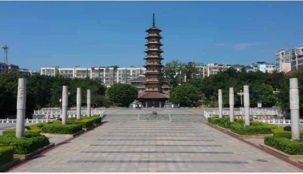 伫立在浈江畔上的三影塔,始建于北宋大中祥符二年(1009)。据清道光《直隶南雄州志》记载:“其影有三,两影倒悬,一影向上,故曰三影塔。”这座六角九层楼阁式砖塔,坐北向南,平面六角形,通高50.2米,是南雄重要地标。1988年,三影塔被国务院列入第三批全国重点文物保护单位。