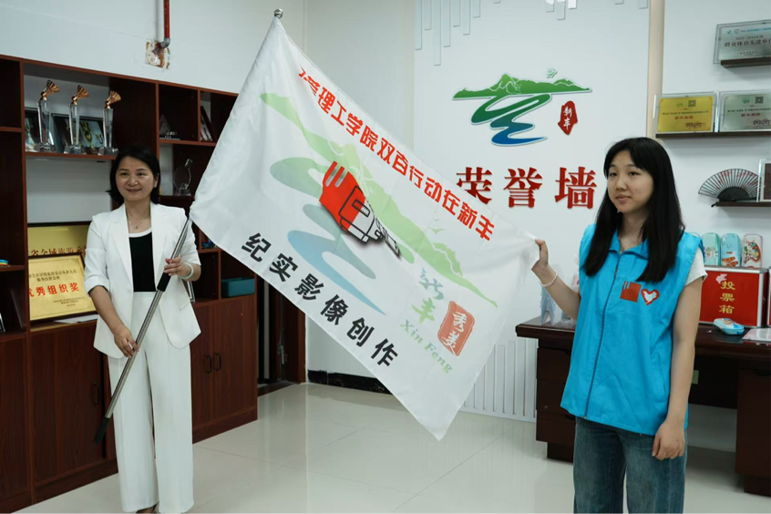 新丰县文广旅体局党组书记、局长谭惠云在致辞中强调,此次项目将通过现代影像技术活化非遗技艺与地方饮食文化,助力“新丰味”品牌升级,推动文旅经济与乡村振兴深度融合。新丰县政协原党组副书记、原副主席嵇春表示,希望围绕新丰讲好红色故事和文化传承,感谢莞工文传师生持续的双向奔赴。东莞理工学院文传学院党委书记阎江表示,学院将延续“红色闪耀”的校地协作模式,组织师生深入非遗村落,以无人机航拍、VR体验、短视频等创新形式记录传统文化,为乡村文化振兴注入专业力量。学生代表也表示将积极用青年视角讲好非遗故事,为文化传承注入新活力。会议期间,新丰县文广旅体局党组书记、局长谭惠云为学生代表授旗。